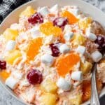 Keywords: Ambrosia Salad, fruit salad, pineapple, mandarin oranges, maraschino cherries, mini marshmallows, shredded coconut, sour cream, creamy dessert, no-cook dessert