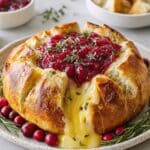 This Baked Brie in Bread Bowl with Cranberry Sauce and Thyme is a delightful appetizer perfect for gatherings and festive occasions. Creamy melted brie is nestled inside a rustic bread boule, topped with tangy cranberry sauce and fragrant fresh thyme, then baked until warm and gooey. The crusty scored bread edges make for perfect dippers, creating a deliciously shareable dish that combines the savory richness of cheese with bright fruit and herb flavors.