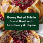 Baked Brie in a bread bowl is a crowd-pleasing appetizer that combines creamy cheese with tangy cranberry sauce and fragrant thyme. It’s perfect for gatherings or cozy nights in. The crusty bread acts as both a vessel and a delicious accompaniment for dipping.