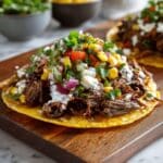 These BBQ Beef Street Corn Tacos combine tender, smoky chuck roast with a vibrant grilled corn salad and a creamy homemade ranch dressing. Slow-smoked beef seasoned with a BBQ rub and finished with cherry cola and BBQ sauce creates deep layers of flavor. Paired with fresh vegetables, zesty lime, and melted Oaxaca cheese on warm corn tortillas, these tacos offer a perfect balance of smoky, tangy, and creamy elements for a delicious and satisfying meal.