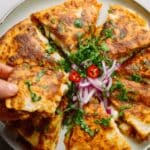 A round white plate holds a sliced quesadilla cut into eight triangular pieces, each piece showing a golden-brown crispy layer with melted cheese oozing out slightly. On top of the quesadilla, there is a small pile of fresh green cilantro leaves, thin slices of red onion, and small red chili pieces, adding bright color and texture contrast. A woman's hand is lifting one slice, showing the melted cheese stretching. The background is a white marbled texture. Photo taken with an iphone --ar 4:5 --v 7