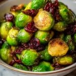 Delicious roasted Brussels sprouts tossed in a sweet and tangy cranberry-orange glaze, accented with dried cranberries and toasted pecans for a delightful holiday side dish or a flavorful addition to any meal.