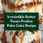 Butter Pecan Praline Poke Cake is a deliciously moist dessert that combines the rich flavors of butter pecan cake with a sweet praline sauce. This easy-to-make treat is perfect for gatherings or a special family dessert, topped with whipped cream and toasted pecans for added texture and flavor.