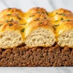 The dish shows a close-up of a baked casserole with two clear layers. The bottom layer is a rich brown ground meat mixture with a moist and chunky texture. The top layer consists of golden brown, fluffy biscuit-like dough pieces with crispy edges and some melted cheese on top, sprinkled with small green herb leaves. The layers are packed tightly, with the soft, creamy biscuit layer sitting evenly over the meat. The background is a white marbled texture. Photo taken with an iphone --ar 4:5 --v 7