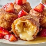 Delightful and crispy Cheesecake Egg Rolls featuring a creamy sweetened cream cheese filling wrapped in crunchy egg roll wrappers, fried to golden perfection, and rolled in cinnamon sugar. Served with optional toppings like caramel, chocolate, strawberries, or powdered sugar, this dessert offers a fun twist on classic cheesecake.
