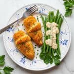Two golden-brown breaded chicken breasts sit side by side on the left half of a white plate with blue patterns, sprinkled with small green herb pieces. On the right side, a neat bunch of glossy green beans is topped with a smooth, light cream sauce. Fresh green parsley leaves are placed near the beans, adding a fresh look. A silver fork rests on the plate's upper left edge. The plate sits on a white marbled surface with scattered green herb leaves around. Photo taken with an iphone --ar 4:5 --v 7