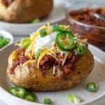Store any leftover chili and baked potatoes separately in airtight containers in the refrigerator for up to 3 days. Reheat the chili on the stove or microwave until hot, and warm the potato in the oven or microwave before assembling the toppings again for best texture.