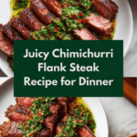 This Chimichurri Flank Steak recipe features tender and flavorful grilled flank steak marinated and topped with a vibrant, fresh chimichurri sauce made from garlic, parsley, cilantro, olive oil, lemon juice, and spices. Perfect for a quick yet impressive meal, the steak is seared in a cast iron skillet to lock in juices and served sliced with a generous drizzle of the herbaceous chimichurri.