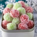 Festive and colorful Christmas Jello Balls made with lime and strawberry jello, combined with Greek yogurt and coated in sweetened desiccated coconut. These no-bake treats are easy to prepare and perfect for holiday parties and celebrations.