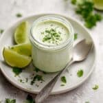 A small glass jar filled with a creamy light green sauce speckled with tiny green herbs, placed on a white plate with another white plate underneath. The sauce looks smooth and thick, with a few small herbs sprinkled on top. In the blurry white marbled background, there are lime wedges and some green herb leaves scattered around, adding contrast to the soft colors of the sauce. photo taken with an iphone --ar 4:5 --v 7