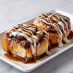 The image shows two large cinnamon rolls placed side by side on a white rectangular plate, resting on a white marbled surface. Each roll has visible layers of soft, golden-brown dough tightly swirled with a dark cinnamon filling. The rolls are generously covered with thick white icing drizzled in stripes across the top, with a glossy caramel sauce layered in thinner lines on top of the icing, creating a rich contrast of colors and textures. The overall look is warm, gooey, and inviting, with the sauces slightly dripping off the sides. Photo taken with an iphone --ar 4:5 --v 7