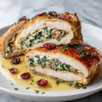 This Cranberry & Spinach Stuffed Chicken Breast with Goat Cheese is a flavorful and elegant dish that’s perfect for a special dinner or a cozy night in. The combination of tangy cranberries, creamy goat cheese, and fresh spinach creates a delightful filling inside tender chicken breasts.