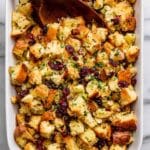 Keywords: cranberry apple stuffing, sourdough stuffing, holiday stuffing, Thanksgiving side dish, savory stuffing recipe, herb stuffing
