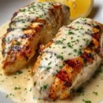 The image shows two grilled chicken breasts placed side by side on a white plate. The chicken is golden brown with char marks, topped generously with a creamy white sauce that has a smooth texture and slight sheen. The sauce is sprinkled with finely chopped green herbs for color contrast. There are two lemon wedges visible at the edge of the plate on a white marbled surface. The overall look is warm and inviting, highlighting the rich sauce and grilled texture. Photo taken with an iphone --ar 4:5 --v 7