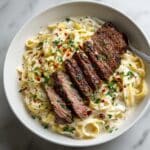 This creamy steak pasta with garlic is a comforting and indulgent dish that’s perfect for a hearty dinner. Tender slices of seared steak are combined with a rich, flavorful sauce that coats every strand of pasta. It’s easy to make yet impressive enough for guests.