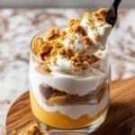 - Layer the Trifle: Using two small glasses or glass dishes, begin layering the dessert by first adding a layer of crushed gluten-free graham crackers. Next, add a layer of the pumpkin cheesecake mixture, followed by a layer of coconut whipped cream. Repeat these layers until the glasses are nearly full.