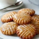 A white plate holds several round cookies with ridged edges and a golden brown color. Each cookie has a glossy glaze on top, with visible brush marks creating a striped pattern, and is sprinkled with coarse sugar crystals. The texture looks crispy around the edges with a slightly softer center. The plate is set on a white marbled surface, and in the blurred background, a white cup and saucer with a metal spoon are visible. photo taken with an iphone --ar 4:5 --v 7