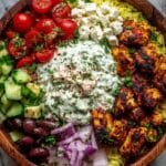 These Greek Chicken Souvlaki Bowls feature tender, marinated chicken cooked to golden perfection and served over fluffy rice, topped with fresh vegetables and a creamy garlic yogurt sauce. A vibrant, healthy, and flavorful meal inspired by traditional Greek flavors, perfect for a quick weeknight dinner or a satisfying lunch.