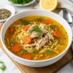Greek Lemon Chicken Soup is a comforting and tangy traditional soup made with chicken broth, fresh lemon juice, tender vegetables, and fragrant spices. This classic Greek recipe features a creamy, velvety texture achieved by tempering egg yolks into the broth and is enriched with cooked chicken and white rice for a hearty meal. Garnished with fresh lemon slices, it’s a deliciously bright and soothing dish perfect for any season.