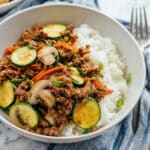 A quick and flavorful Ground Beef Stir Fry featuring tender zucchini, mushrooms, and julienned carrots tossed in a savory-sweet sauce made with soy, BBQ sauce, maple syrup, garlic, and ginger. Perfect for a healthy weeknight dinner served over rice or in lettuce cups.