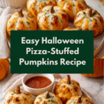 These Easy Pizza-Stuffed Pumpkins are a fun and festive Halloween dinner idea featuring biscuit dough filled with a flavorful ricotta and mozzarella cheese mixture. Shaped like pumpkins using kitchen twine and topped with a garlic butter glaze, these cheesy stuffed dough balls are baked to golden perfection and served with marinara sauce and pretzel stick stems for a playful presentation.