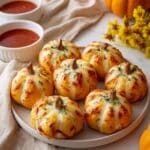 These Easy Pizza-Stuffed Pumpkins are a fun and festive Halloween dinner idea featuring biscuit dough filled with a flavorful ricotta and mozzarella cheese mixture. Shaped like pumpkins using kitchen twine and topped with a garlic butter glaze, these cheesy stuffed dough balls are baked to golden perfection and served with marinara sauce and pretzel stick stems for a playful presentation.