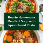 A hearty and comforting Meatball Soup featuring tender homemade meatballs simmered in a flavorful broth with vegetables, pasta, and fresh spinach. Perfect for a cozy meal packed with Italian-inspired flavors and wholesome ingredients.