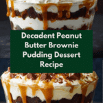 Keywords: brownie pudding dessert, peanut butter dessert, no bake dessert, layered dessert, Reese’s dessert, easy pudding recipe