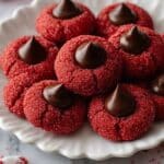 Hershey’s Red Velvet Blossoms are soft, tender red velvet cookies coated in vibrant red sanding sugar and topped with classic Hershey chocolate kisses. These delightful cookies combine a subtle cocoa flavor with a hint of vanilla and a festive red hue, perfect for holidays, parties, or any special occasion.