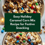 Holiday Caramel Corn Mix is a delightful treat that combines the crunch of popcorn and nuts with sweet caramel, chocolate, and festive candies. It’s perfect for sharing during the holidays or enjoying as a special snack.