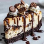 Store leftovers covered in the refrigerator for up to 4 days. Keep the hot fudge and garnishes separate until ready to serve for the best texture. Reheat slices gently in the microwave if you prefer a warm bite, but cheesecake is best enjoyed chilled.