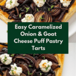 Keywords: caramelized onion tart, goat cheese tart, puff pastry tart, easy appetizer, French appetizer, vegetarian tart