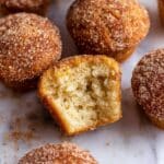 The image shows several small, round muffins covered in a layer of granulated cinnamon sugar, sitting on a white marbled surface. One muffin is broken open, revealing a soft, light beige, fluffy inside with a slightly crumbly texture. The outer layer is golden brown with a rough sugar-crystal coating that glistens in the light. The muffins are closely arranged in a casual pattern with some crumbs scattered around. Photo taken with an iphone --ar 4:5 --v 7