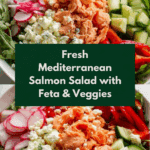 A fresh and nutritious Mediterranean Salmon Salad featuring a mix of crisp vegetables, tender cooked salmon, and tangy feta cheese, dressed simply with olive oil and lemon juice for a light, healthy meal perfect for any time of day.