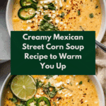 Keywords: Mexican street corn soup, elote soup, creamy corn soup, Mexican soup recipe, poblano pepper soup, cotija cheese soup, easy Mexican recipes