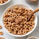 4. Coat with Cinnamon Sugar: Immediately sprinkle the toasted Cheerios with the cinnamon sugar mixture. Stir or toss well to ensure every piece is thoroughly coated with the flavorful mixture.
