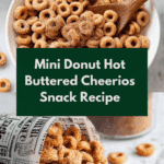 Mini Donut Hot Buttered Cheerios is a deliciously sweet and buttery snack made by toasting Cheerios in melted butter, infused with vanilla, and coated in a cinnamon sugar blend for a warm, comforting flavor perfect for anytime snacking.