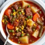 This old-fashioned vegetable beef soup is a hearty, comforting dish featuring tender shredded beef roast simmered with a medley of vegetables in a flavorful beef and tomato broth. Perfect for a cozy meal, this slow-cooked recipe combines potatoes, carrots, green beans, peas, and corn for a classic, satisfying soup.
