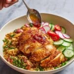 A white bowl is filled with a base layer of fried rice mixed with green herbs and sliced red sausages, topped with a thick, crispy-skinned golden brown chicken breast sliced into pieces and laid neatly on top. Around the chicken, there are fresh cucumber slices and radishes adding green and pale pink color. A red chili slice and extra small tomato pieces are scattered on the fried rice. A woman's hand holds a spoon above the chicken, pouring a shiny red chili oil sauce onto it. The bowl is set on a white marbled surface. photo taken with an iphone --ar 4:5 --v 7