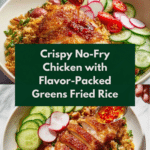 A delicious and healthier take on classic fried chicken and greens fried rice, this recipe features crispy ‘no-fry’ fried chicken cooked using a pan-pressing technique to achieve a golden crust without deep frying, paired with a flavorful greens fried rice made with Chinese sausage, Asian greens, and eggs. It’s perfect for a satisfying meal that combines texture and fresh flavors with optional fresh cucumber, radish, and chili for extra brightness.