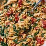 One Pan Marry Me Chicken Orzo is a flavorful and comforting dish featuring tender chicken breast cubes cooked with sun-dried tomatoes, garlic, and Italian seasonings. Combined with creamy coconut milk or heavy cream, fresh spinach, and Parmesan cheese, this easy one-pan meal delivers a delicious blend of savory, creamy, and tangy flavors with minimal cleanup.