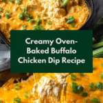 This Oven Buffalo Chicken Dip is a creamy, spicy, and cheesy appetizer perfect for game day or parties. Combining shredded chicken with buffalo sauce, cream cheese, ranch dressing, and cheddar cheese, this dip is baked until bubbly and golden on top. Serve it warm with chips, crackers, or fresh vegetables for a crowd-pleasing snack that’s easy to make and packed with bold flavors.