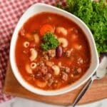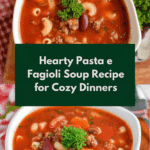 Hearty and comforting Pasta e Fagioli Soup combines ground beef, vegetables, beans, and small pasta in a flavorful tomato and herb broth. This classic Italian-inspired soup is perfect for a filling meal, garnished with Parmesan cheese and fresh parsley.