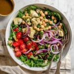A fresh and vibrant Quick and Easy Artichoke Salad featuring tangy lemon-marinated onions, tender artichoke hearts, cherry tomatoes, olives, garbanzo beans, and peppery arugula all tossed in a flavorful balsamic vinaigrette. Perfect for a light lunch or a speedy side dish.