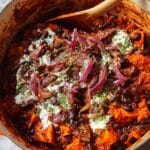 A thick stew with two main layers in a large white pot with an orange rim; the bottom layer is dark red sauce mixed with black beans and bright orange chunks of cooked sweet potato, showing a rich and hearty texture; the top layer has caramelized red onions with shiny, soft, and slightly translucent edges, scattered over the stew, and dollops of white cream sauce streaked with green herbs adding contrast; the inside walls of the pot are stained with thick red sauce, and a wooden spoon is partially dipped into the stew, the photo taken on a white marbled surface; photo taken with an iphone --ar 4:5 --v 7
