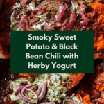 Keywords: sweet potato chili, black bean chili, smoky chili recipe, vegetarian chili, chipotle chili, herby yogurt sauce, quick pickled onions, healthy chili, Mexican-inspired chili