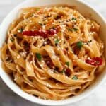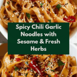 A flavorful and spicy chili garlic noodle dish featuring tender rice noodles tossed in a savory sauce made with garlic, ginger, soy sauce, and chili garlic sauce. Finished with fresh herbs, toasted sesame seeds, and a squeeze of lime, this recipe offers a quick and satisfying meal with a perfect balance of heat and umami.