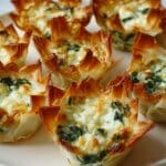 These Spinach and Artichoke Wonton Cups are a delicious, bite-sized appetizer featuring a creamy blend of cheeses, spinach, and artichoke hearts baked inside crispy wonton wrappers. Perfect for parties or a tasty snack, these savory cups are easy to make and packed with cheesy, savory flavor.