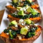 These Stuffed Sweet Potatoes are a delicious and nutritious vegetarian meal featuring roasted sweet potatoes filled with a savory mixture of sautéed spinach, mushrooms, and feta cheese, topped with creamy avocado and fresh parsley. Perfect as a wholesome lunch or dinner, this recipe balances hearty flavors with wholesome ingredients for a satisfying dish.