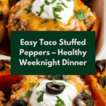 These Taco Stuffed Peppers are a delicious and healthy twist on classic tacos, filled with a flavorful mixture of seasoned ground beef, black beans, corn, tomatoes, and brown rice, all baked inside tender bell pepper halves and topped with melted cheddar jack cheese.